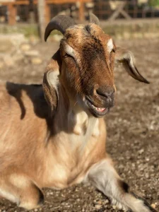Yoko est la mère de cœur de beaucoup de nos pensionnaires. À chaque arrivée d’un jeune non sevré, elle se remet à produire du lait sans que nous n’y soyons pour quelque chose – sa dernière protégée a été Pimprenelle, une petite chèvre qui nous a rejoint en avril 2025.